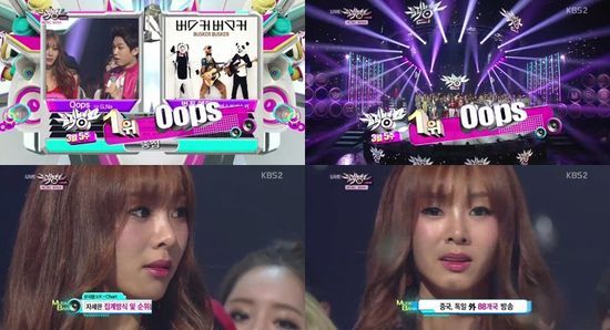 지나는 29일 오후 방송된 '뮤직뱅크'에서 타이틀곡 '웁스(Oops)'로 버스커버스커의 '벚꽃엔딩'을 제치고 1위를 차지했다.
