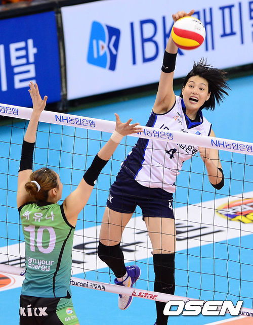 29일 오후 경북 구미 박정희체육관에서 열린 '2012-2013 NH농협 V리그' 여자부 챔피언결정전 4차전 GS칼텍스와 IBK기업은행의 경기 1세트 김희진이 공격을 시도하고 있다.