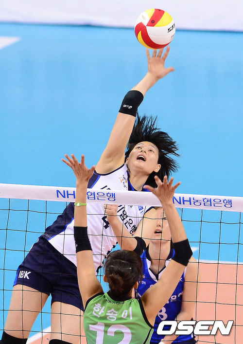 29일 오후 경북 구미 박정희체육관에서 열린 '2012-2013 NH농협 V리그' 여자부 챔피언결정전 4차전 GS칼텍스와 IBK기업은행의 경기 1세트 김희진이 공격을 시도하고 있다.