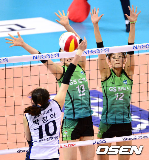 29일 오후 경북 구미 박정희체육관에서 열린 '2012-2013 NH농협 V리그' 여자부 챔피언결정전 4차전 IBK기업은행과 GS칼텍스의 경기, 1세트 GS칼텍스 정대영과 한송이가 IBK기업은행 박정아의 공격을 블로킹 하고 있다.