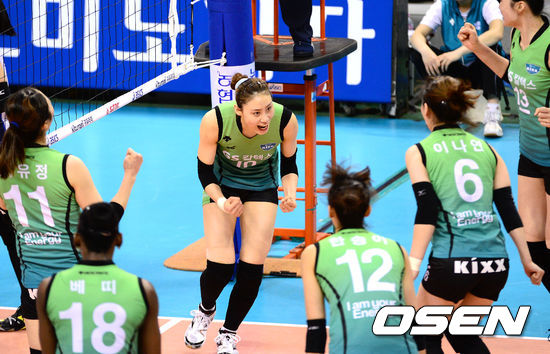 29일 오후 경북 구미 박정희체육관에서 열린 '2012-2013 NH농협 V리그' 여자부 챔피언결정전 4차전 IBK기업은행과 GS칼텍스의 경기, 2세트 득점에 성공한 GS칼텍스 배유나가 동료들과 환호하고 있다.