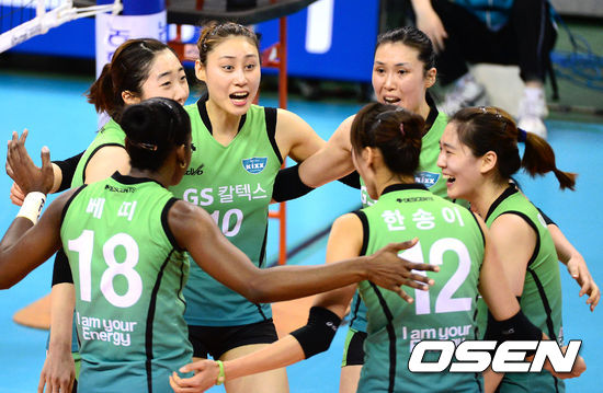 29일 오후 경북 구미 박정희체육관에서 열린 '2012-2013 NH농협 V리그' 여자부 챔피언결정전 4차전 IBK기업은행과 GS칼텍스의 경기, 2세트를 승리한 GS칼텍스 선수들이 환호하고 있다.