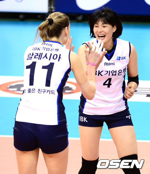 29일 오후 경북 구미 박정희체육관에서 열린 '2012-2013 NH농협 V리그' 여자부 챔피언결정전 4차전 IBK기업은행과 GS칼텍스의 경기, 3세트 득점에 성공한 IBK기업은행 김희진과 알레시아가 하이파이브를 하고 있다.