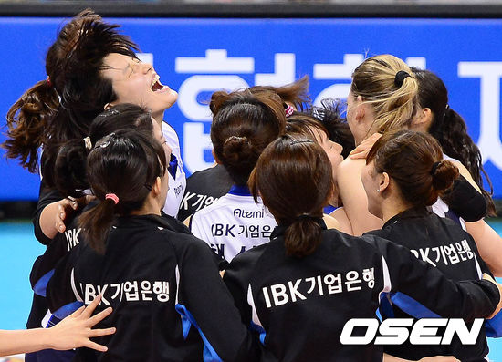 IBK기업은행은 29일 구미박정희체육관에서 열린 NH농협 2012-2013시즌 V리그 여자부 챔피언결정전 4차전 GS칼텍스와 경기서 세트스코어 3-1(25-18, 20-25, 25-19, 25-21)로 승리를 거두고 우승을 차지했다. 창단 2년만에 거둔, V리그 여자부 '막내'의 쾌거였다. / baik@osen.co.kr