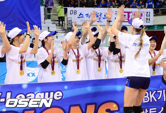 IBK기업은행은 29일 구미박정희체육관에서 열린 NH농협 2012-2013시즌 V리그 여자부 챔피언결정전 4차전 GS칼텍스와 경기서 세트스코어 3-1(25-18, 20-25, 25-19, 25-21)로 승리를 거두고 우승을 차지했다. 창단 2년만에 거둔, V리그 여자부 '막내'의 쾌거였다. / baik@osen.co.kr