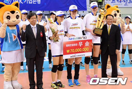 IBK기업은행은 29일 구미박정희체육관에서 열린 NH농협 2012-2013시즌 V리그 여자부 챔피언결정전 4차전 GS칼텍스와 경기서 세트스코어 3-1(25-18, 20-25, 25-19, 25-21)로 승리를 거두고 우승을 차지했다. 창단 2년만에 거둔, V리그 여자부 '막내'의 쾌거였다. / baik@osen.co.kr