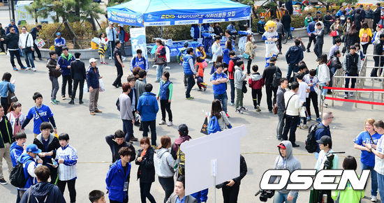경기에 앞서 경기장에 입장하려는 야구팬들이 줄을 서서 기다리고 있다.