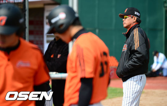 30일 오후 부산 사직구장에서 열리는 '2013 한국야쿠르트 세븐 프로야구' 롯데 자이언츠와 한화 이글스의 경기 시작 전 김시진 감독이 선수들의 타격훈련을 지켜보고 있다.