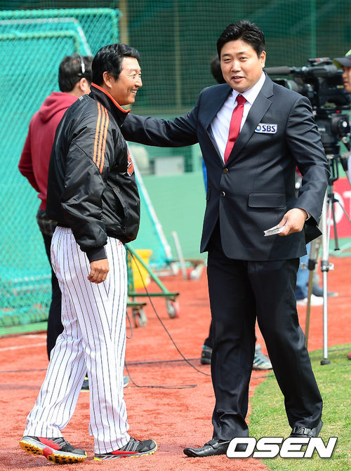 30일 오후 부산 사직구장에서 열리는 '2013 한국야쿠르트 세븐 프로야구' 롯데 자이언츠와 한화 이글스의 경기 시작 전 양준혁 해설위원(오른쪽)과 정민태 코치가 인사를 나누고 있다.
