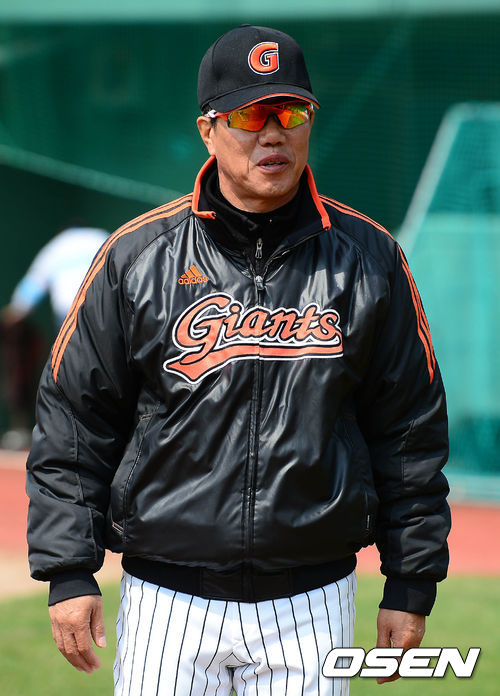 30일 오후 부산 사직구장에서 열리는 '2013 한국야쿠르트 세븐 프로야구' 롯데 자이언츠와 한화 이글스의 경기 시작 전 김시진 감독이 선수들의 훈련을 지켜보고 있다.