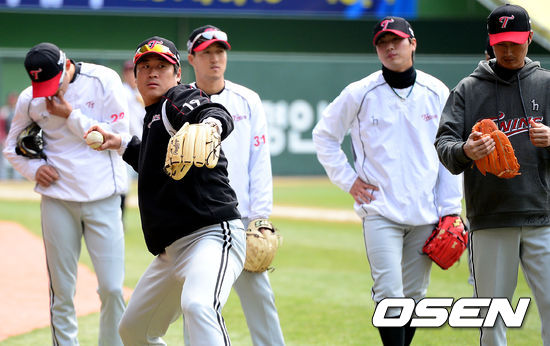 경기에 앞서 LG 정현욱이 동료선수들과 수비훈련을 하고 있다.