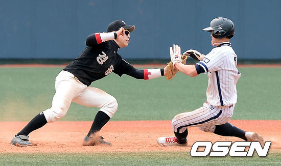 30일 오후 서울 신월구장에서 열린 '2013 고교야구 주말리그' 서울고와 경동고의 경기 3회초 2사 1루 서울고 박형규가 2루 도루를 시도하다 경동고 홍승범에게 태그아웃 당하고 있다.