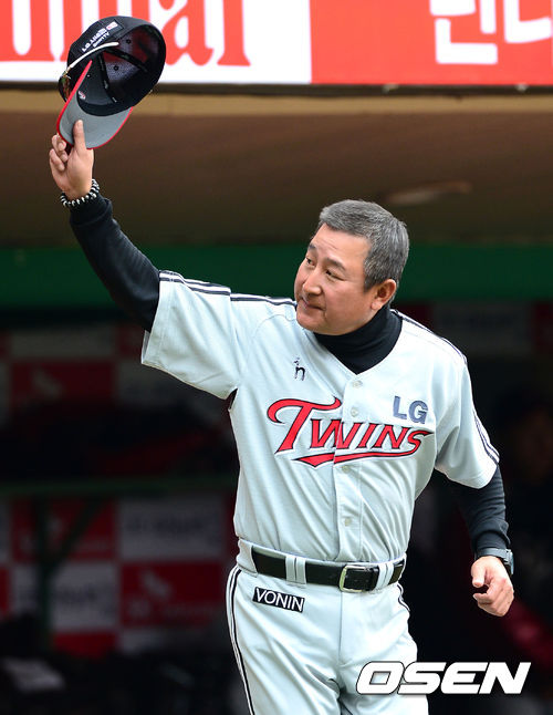 경기에 앞서 LG 김기태 감독이 입장을 하며 팬들에게 인사를 하고 있다.