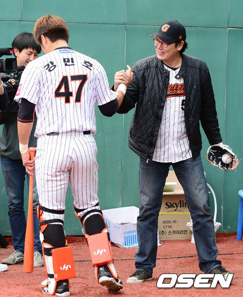 30일 오후 부산 사직구장에서 열린 '2013 한국야쿠르트 세븐 프로야구' 롯데 자이언츠와 한화 이글스의 경기 시작 전 강민호와 배우 조진웅이 이사를 나누고 있다. 조진웅은 이날 시구를 했다.