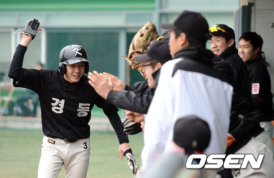 30일 오후 서울 신월구장에서 열린 '2013 고교야구 주말리그' 서울고와 경동고의 경기 5회말 1사 만루 경동고 조민석이 주민재 타석때 밀어내기 볼넷으로 득점으로 올린 뒤 더그아웃에서 동료들과 기뻐하고 있다.