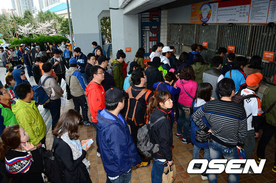 30일 오후 부산 사직구장에서 열린 '2013 한국야쿠르트 세븐 프로야구' 롯데 자이언츠와 한화 이글스의 경기 시작 전 관중들이 예매 티켓을 발급받기 위해 기다리고 있다.
