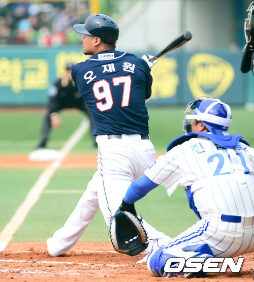 1회초 2사 만루 두산 오재원이 좌월 만루 홈런을 날리고 있다.