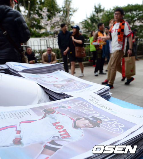 30일 오후 부산 사직구장에서 열린 '2013 한국야쿠르트 세븐 프로야구' 롯데 자이언츠와 한화 이글스의 경기 시작 전 구장 입구에 프로야구 시작을 알리는 신문이 놓여있다.