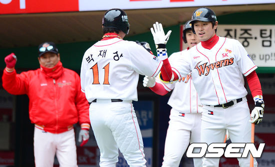 2회말 1사 1,3루에서 SK 조인성의 선제 1타점 좌전 적시타에 홈을 밟은 박재상이 동료선수들과 하이파이브를 하고 있다.