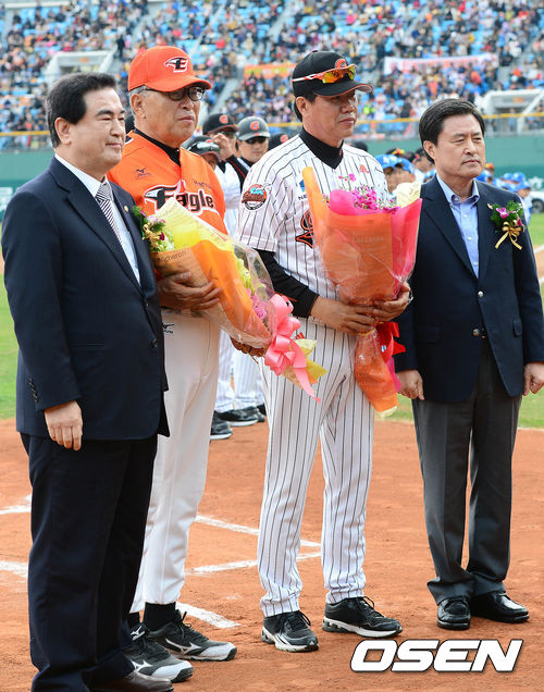 30일 오후 부산 사직구장에서 열린 '2013 한국야쿠르트 세븐 프로야구' 롯데 자이언츠와 한화 이글스의 경기 시작 전 열린 공식행사에서 김응룡 감독과 김시진 감독이 기념촬영을 하고 있다.