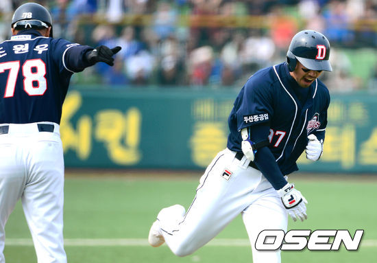 1회초 2사 만루 두산 오재원이 좌월 만루 홈런을 날리고 조원우 코치와 하이파이브를 하고 있다.