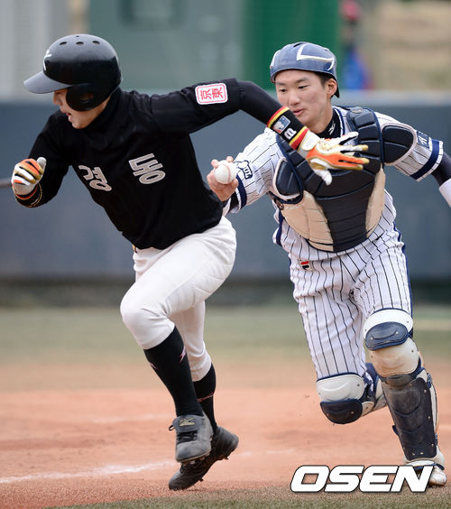 30일 오후 서울 신월구장에서 열린 '2013 고교야구 주말리그' 서울고와 경동고의 경기 6회말 1사 3루 주자 경동고 김의겸이 런다운에 걸려 서울고 최우혁에게 태그아웃 당하고 있다.