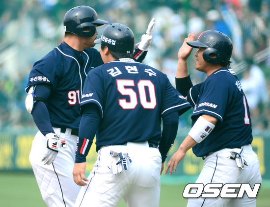 1회초 2사 만루 두산 오재원이 좌월 만루 홈런을 날리고 김현수, 김동주의 축하를 받고 있다.