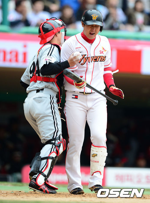 1회말 2사 1루에서 SK 최정이 스트라이크 낫아웃으로 물러나며 아쉬워하고 있다.