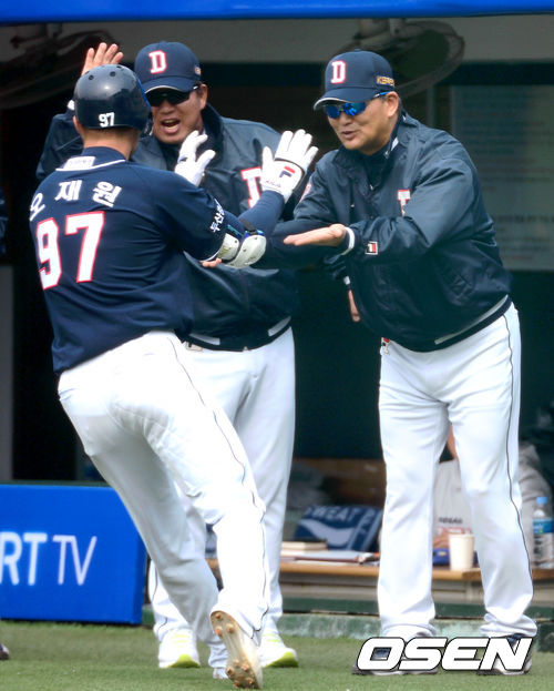 1회초 2사 만루 두산 오재원이 좌월 만루 홈런을 날리고 덕아웃에서 김진욱 감독과 하이파이브를 하고 있다.
