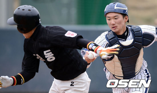 30일 오후 서울 신월구장에서 열린 '2013 고교야구 주말리그' 서울고와 경동고의 경기 6회말 1사 3루 주자 경동고 김의겸이 런다운에 걸려 서울고 최우혁에게 태그아웃 당하고 있다.