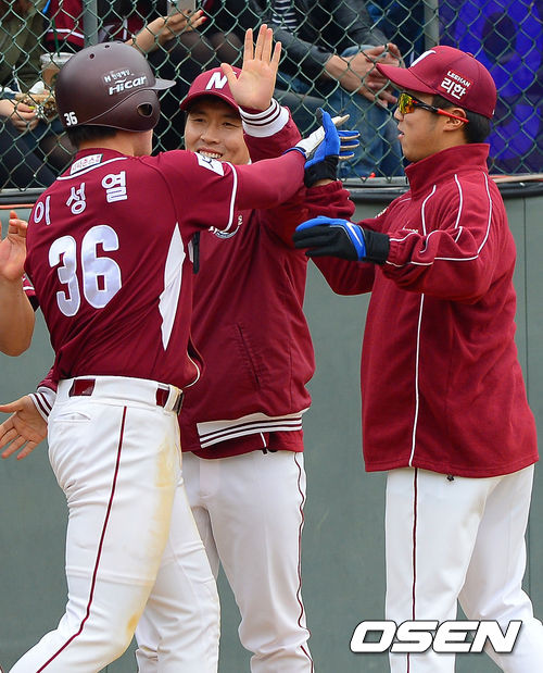30일 오후 광주 무등구장에서 열린 '2013 한국야쿠르트 세븐 프로야구' KIA 타이거즈와 넥센 히어로즈의 경기 2회초 1사 만루 넥센 서건창의 선취 1타점 적시타때 선취 득점을 올린 이성열이 동료들의 축하를 받고 있다