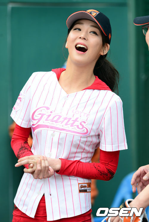 30일 오후 부산 사직구장에서 열린 '2013 한국야쿠르트 세븐 프로야구' 롯데 자이언츠와 한화 이글스의 경기 시작 전 한고은이 조진웅과 이야기를 나누고 있다. 조진웅은 이날 시구를 맡았다.