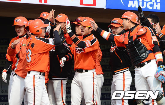 30일 오후 부산 사직구장에서 열린 '2013 한국야쿠르트 세븐 프로야구' 롯데 자이언츠와 한화 이글스의 경기 3회초 2사 1,2루 김태균의 1타점 적시타에 홈을 밟은 연경흠이 덕아웃에서 동료들과 하이파이브를 하고 있다.