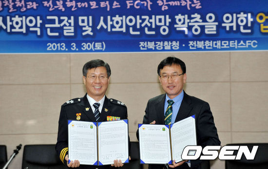 전북은 30일 오후 전주 월드컵경기장서 전북지방경찰청과 MOU를 체결했다. 전북은 전북지방경찰청과 협력해 학교폭력 가·피해 학생들을 대상으로 힐링캠프를 운영, 축구를 가르칠 계획이다.