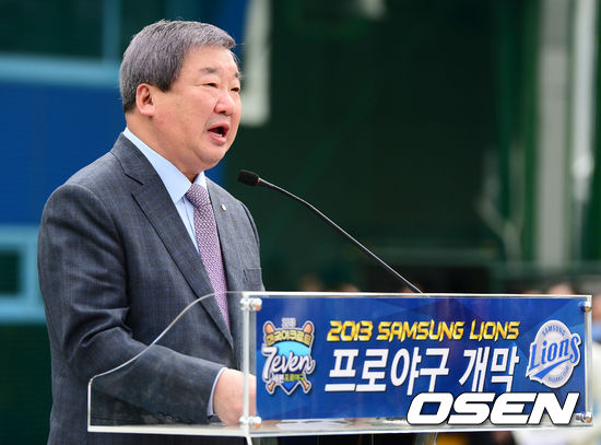 경기에 앞서 구본능 한국야구위원회 총재가 개막 선언을 하고 있다.
