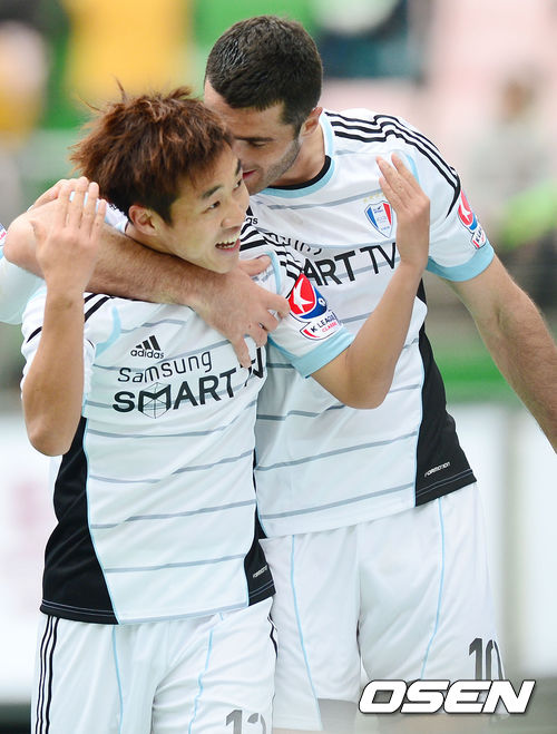 30일 오후 전라북도 전주시 반월동 전주 월드컵경기장에서 '2013 현대오일뱅크 K리그 클래식 4라운드' 전북 현대와 수원 삼성의 경기가 열렸다. 후반 수원 서정진이 팀의 두 번째 골을 넣고 동료들과 환호하고 있다.