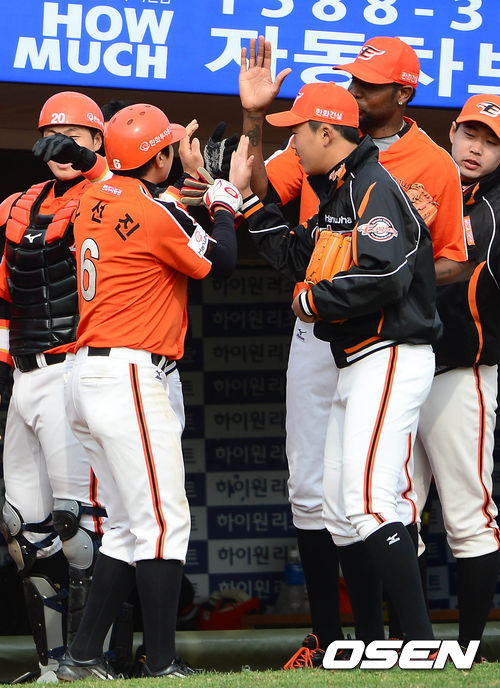 30일 오후 부산 사직구장에서 열린 '2013 한국야쿠르트 세븐 프로야구' 롯데 자이언츠와 한화 이글스의 경기 4회초 2사 1,2루 이대수의 2타점 적시타에 홈을 밟은 2루주자 오선진이 덕아웃에서 동료들과 하이파이브를 하고 있다.