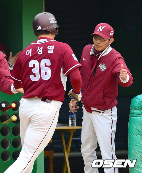 30일 오후 광주 무등구장에서 열린 '2013 한국야쿠르트 세븐 프로야구' KIA 타이거즈와 넥센 히어로즈의 경기 2회초 1사 만루 넥센 서건창의 선취 1타점 적시타때 염경엽 감독이 득점 올린 이성열과 하이파이브를 하고 있다