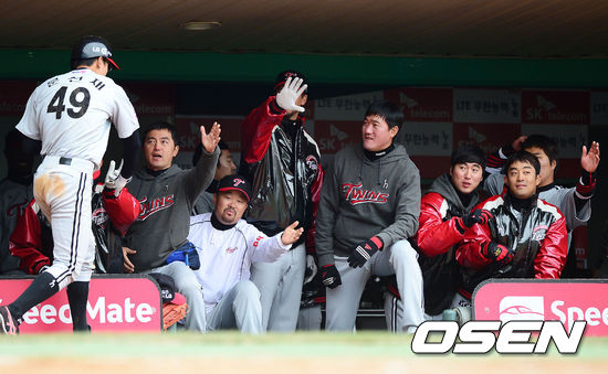 6회초 1사 3루에서 LG 문선재가 정주현의 1루 땅볼에 홈에서 SK 조인성의 태그에 앞서 세이프되며 동료선수들과 하이파이브를 하고 있다.