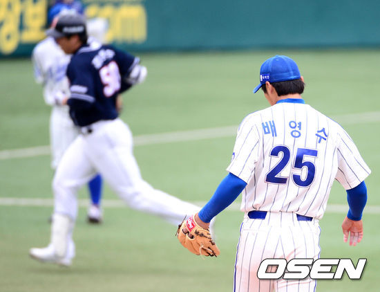 4회초 2사 만루 두산 김현수에게 우월 만루 홈런을 허용한 삼성 배영수가 아쉬워하고 있다.