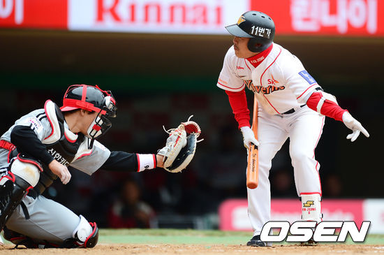 6회말 무사 1루에서 SK 정근우가 삼진을 당하고 아쉬워하고 있다.