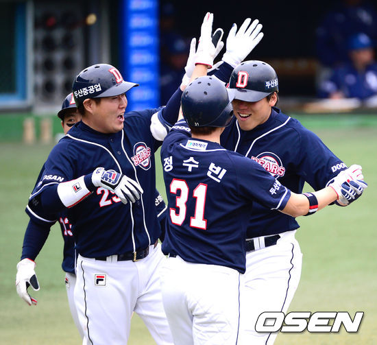 4회초 2사 만루 두산 김현수가 우월 만루 홈런을 날리고 홈에서 손시헌, 양의지, 정수빈의 축하를 받고 있다.
