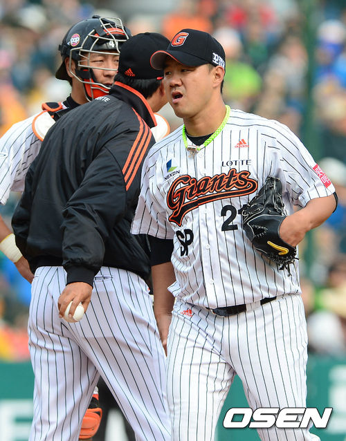 30일 오후 부산 사직구장에서 열린 '2013 한국야쿠르트 세븐 프로야구' 롯데 자이언츠와 한화 이글스의 경기, 송승준이 3⅔이닝 4실점 후 강판당하고 있다.