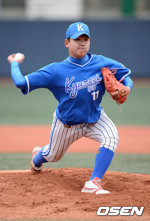 30일 오후 서울 신월구장에서 열린 '2013 고교야구 주말리그' 장충고와 경기고의 경기 1회말 경기고 장민호가 역투하고 있다.