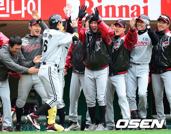 8회초 1사 만루에서 LG 정성훈이 역전 만루홈런을 날리고 동료선수들과 기뻐하고 있다.