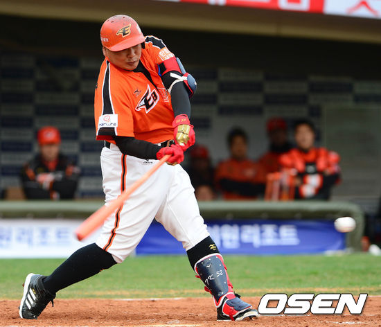 30일 오후 부산 사직구장에서 열린 '2013 한국야쿠르트 세븐 프로야구' 롯데 자이언츠와 한화 이글스의 경기 7회초 2사 1,2루 김태균이 1타점 적시타를 치고 있다.