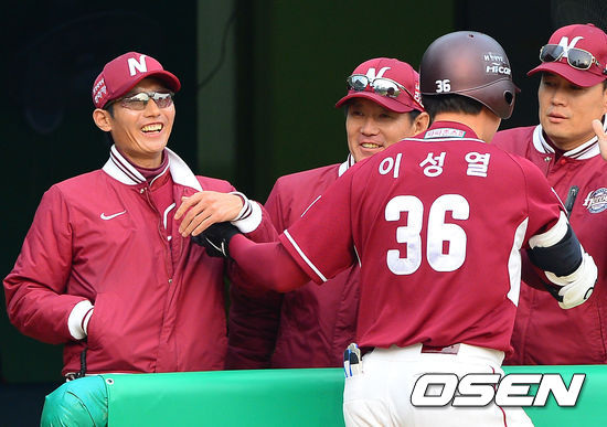 30일 오후 광주 무등구장에서 열린 '2013 한국야쿠르트 세븐 프로야구' KIA 타이거즈와 넥센 히어로즈의 경기 7회초 2사 2루 넥센 이성열이 2점 홈런을 날리고 염경엽 감독과 하이파이브를 하고 있다