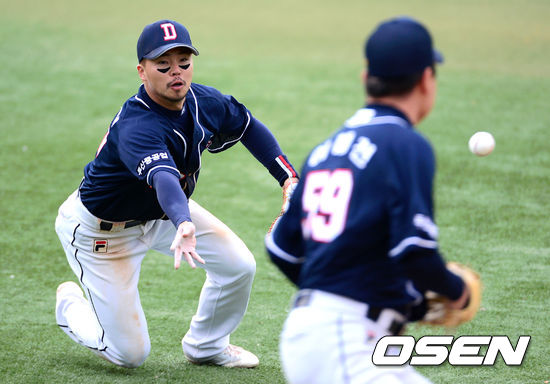 7회말 무사 2루 삼성 정형식의 땅볼 타구를 잡은 두산 오재원이 베이스 커버를 하는 투수 이혜천에게 송구하고 있다.