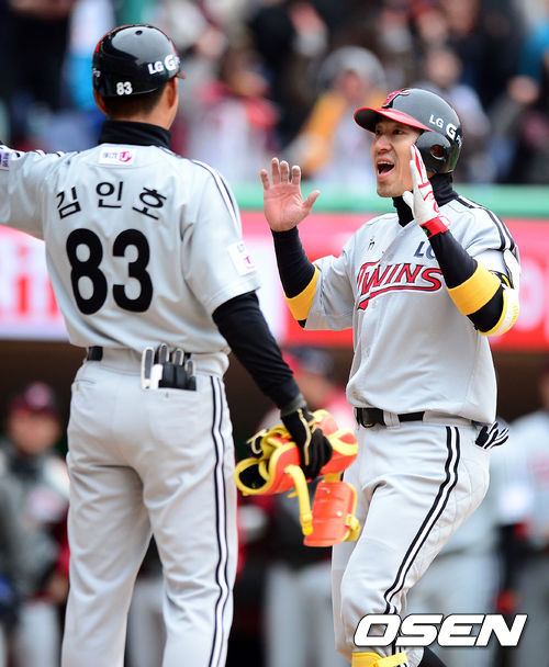 8회초 1사 만루에서 LG 정성훈이 역전 만루홈런을 날리고 김인호 코치와 기뻐하고 있다.