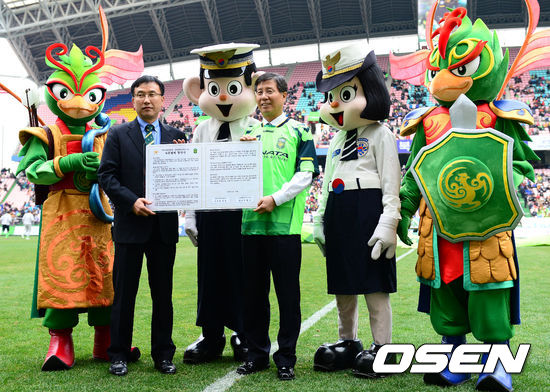 하프타임 때 전북 현대모터스FC 이철근 단장과 전북지방경찰청 홍익태 청장이 '전북지방경찰청-전북현대모터스 FC 교류협력 협약'을 체결한 뒤 기념촬영을 하고 있다.